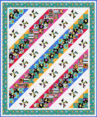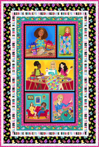 Quilter’s Haven by Satin Moon Designs is a group inspired by quilt retreats. It features a 24” panel, tossed sewing motifs, stitches, fat quarter bundles, coffee and donuts, a selvedge design and fabric swatches. This collection is colored in bright teals, yellows, pinks and blues. The Starlet Basic compliments this group nicely. Enjoy making a quilting themed quilt!